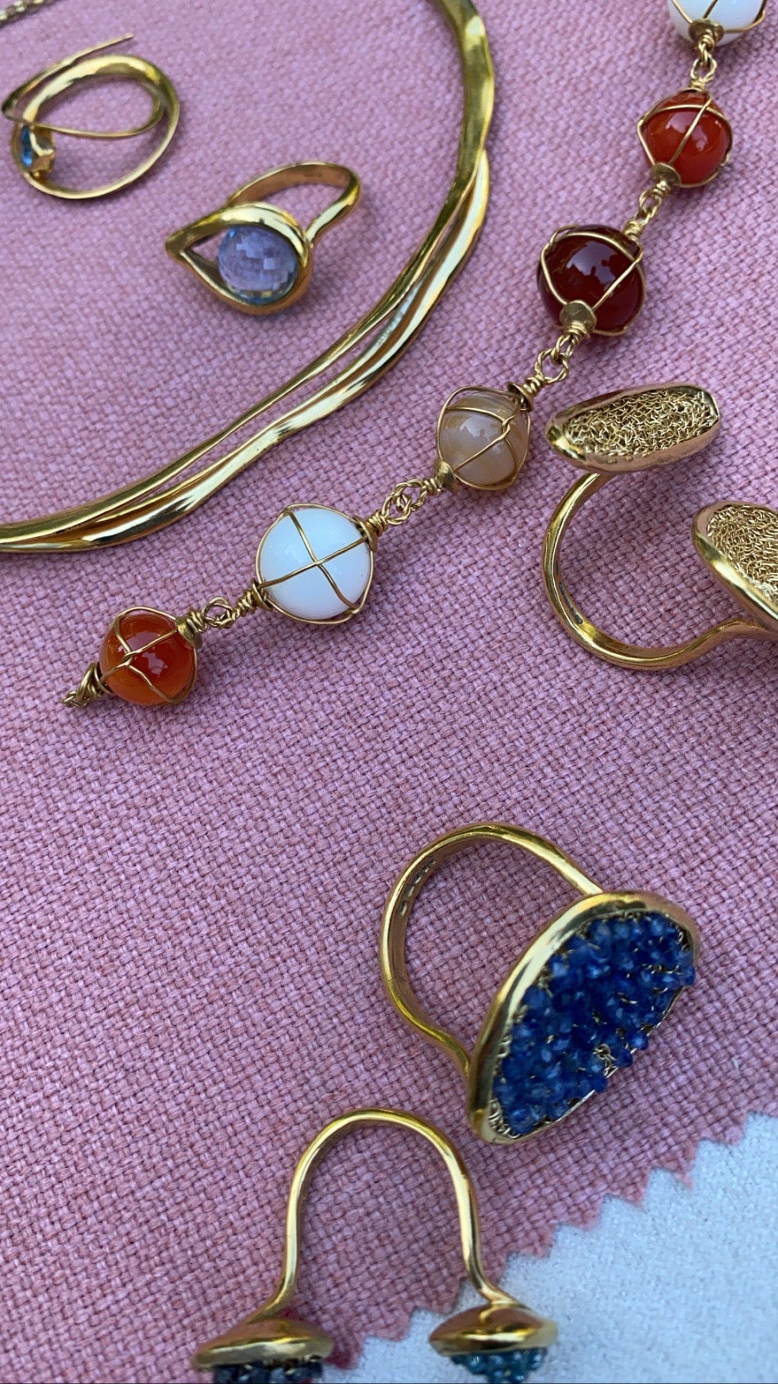 Dipping into the archive to release limited pieces from Rina's first precious material collection, Wave originally launched in spring of 1996, and the Pebble collection of 2002, which brought together her signature handwoven gold with sculptural solid shapes and contours. Both collections deeply inspired by the coastal beauty of the British isles where she resided at the time.